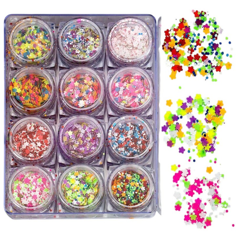 Froomo, маркетплейс професійної косметики та товарів для здоров'я\\Набір декору для манікюру GC-25 мерехтливі квіточки та кружальця 12 кольорів.