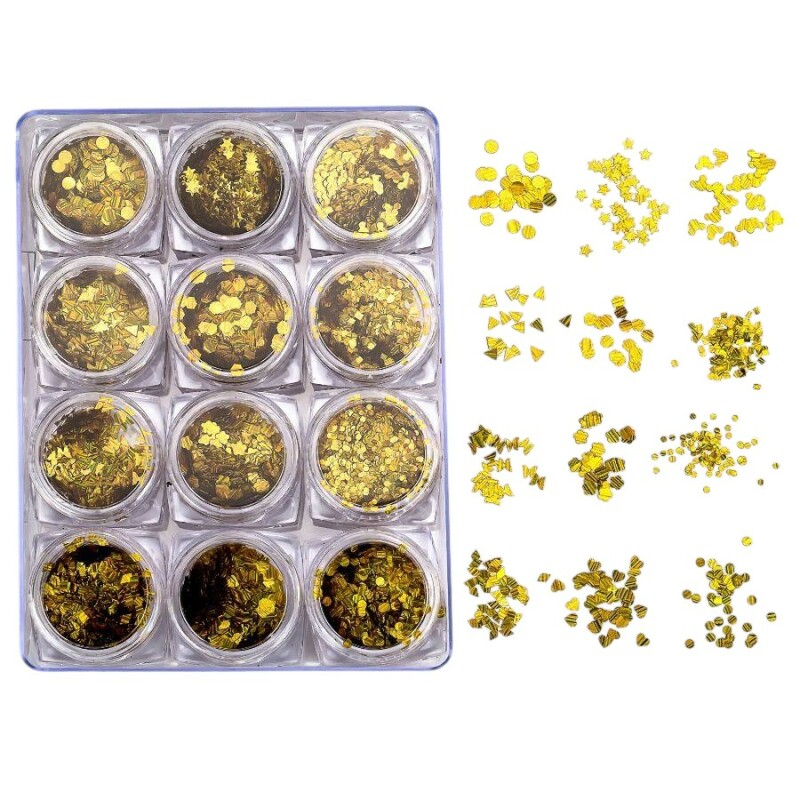 Froomo, маркетплейс професійної косметики та товарів для здоров'я\\Набір декору для манікюру GC-28 золотисті фігури, що мерехтять, 12 форм.