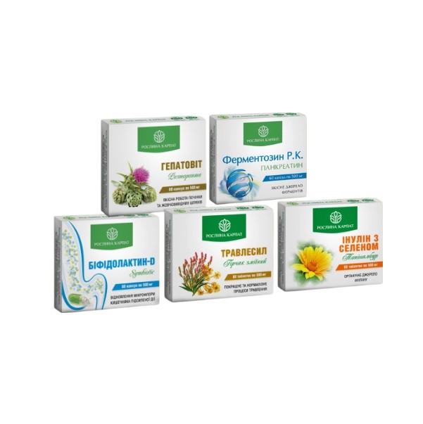Програма для відновлення роботи шлунково-кишкового Гепатовит, Ферментозин, Бифидолактин Д, Травлесил, Инулин с селеном 5 препатів