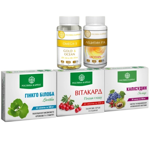 Очищення судин.Комплекна програма. Рослина Карпат Капісудин, Вітакард, Гінгко білоба, Омега 3, Лецитин 5 препаратів