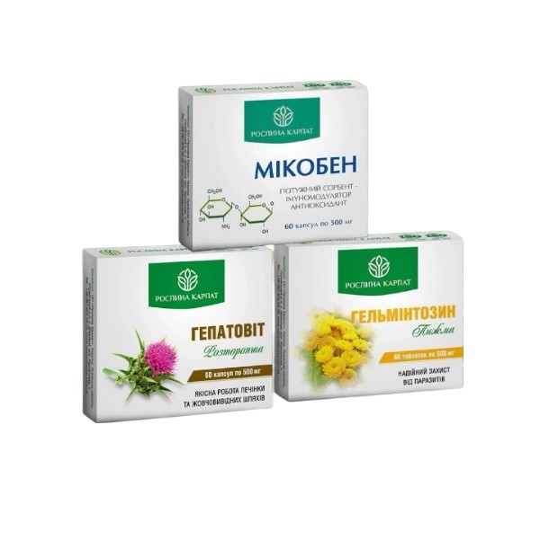 Антипаразитарна програма для дорослих Рослина Карпат Гельмінтозин, Мікобен, Гепатовит 3 препарати