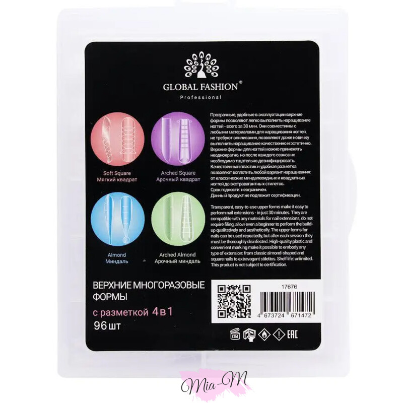 Froomo, маркетплейс професійної косметики та товарів для здоров'я\\Верхние многоразовые формы для наращивания ногтей с разметкой Global Fashion 4 в 1 микс размеров, 96 шт.