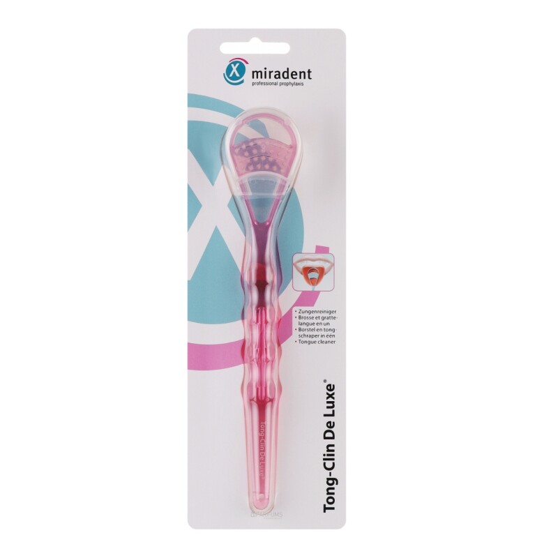 Froomo, маркетплейс професійної косметики та товарів для здоров'я\\Шкребок для очищення язика Tong Clin De Luxe Miradent Рожевий, Щітка для очищення язика Мірадент