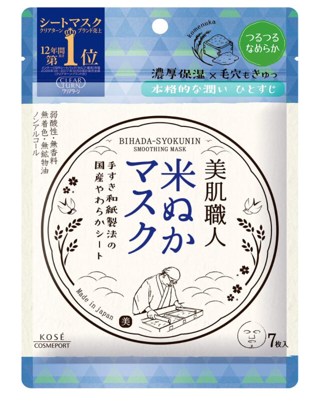 Froomo, маркетплейс професійної косметики та товарів для здоров'я\\Маска на основі рисових відрубай для влаштування і вирівнювання шкіри обличчя KOSE Clear Turn Bihada, 7 шт.