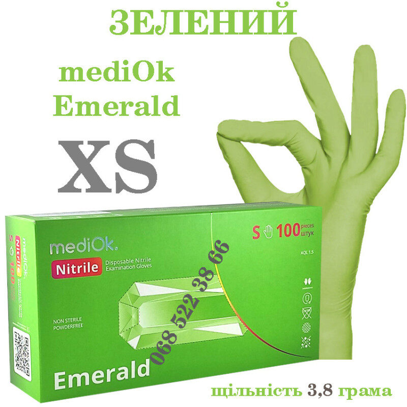 Froomo, маркетплейс професійної косметики та товарів для здоров'я\\Рукавички нітрилові зелені Mediok Emerald розмір L, щільність 3.8 г, уп.100 шт. XS